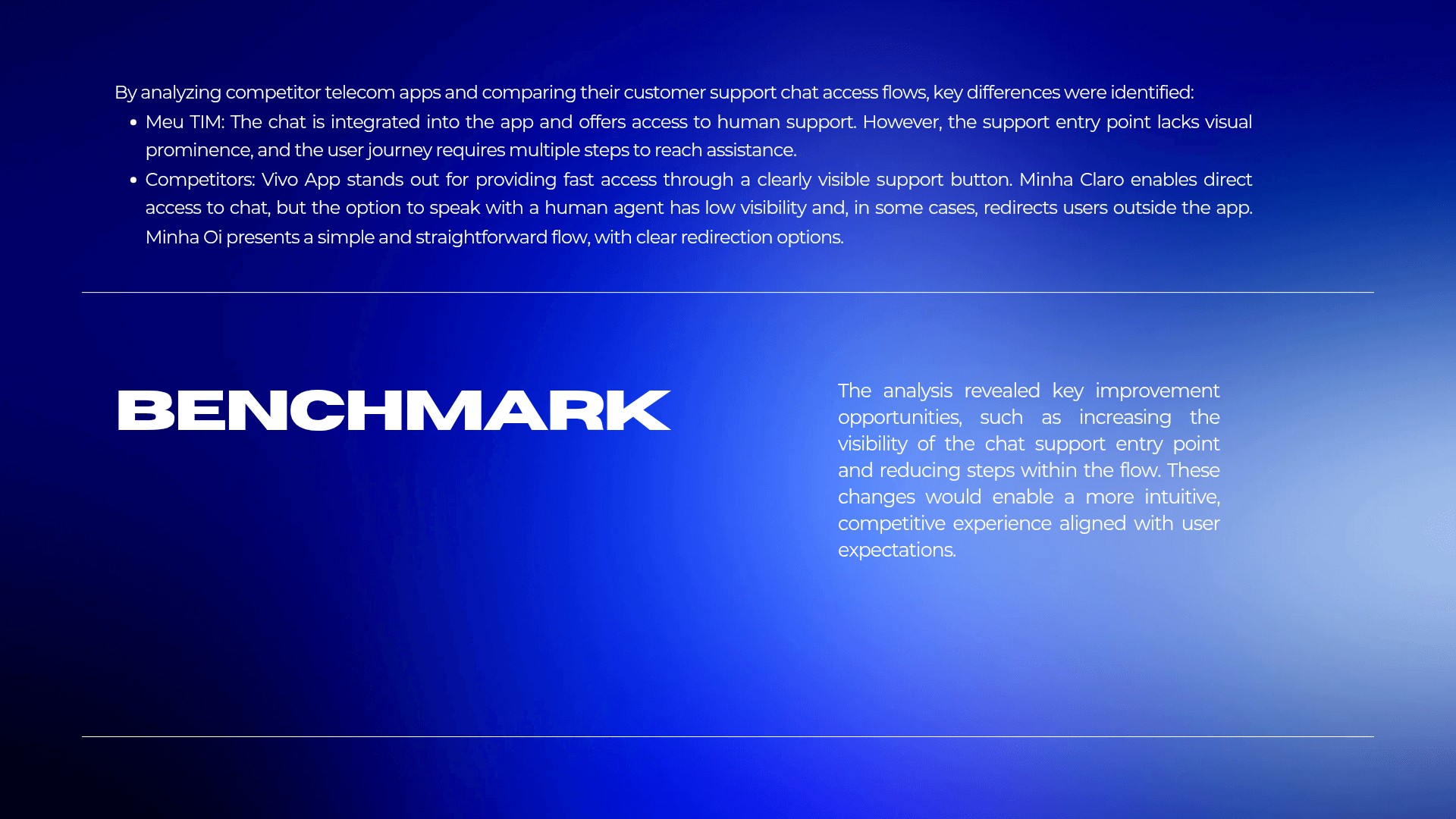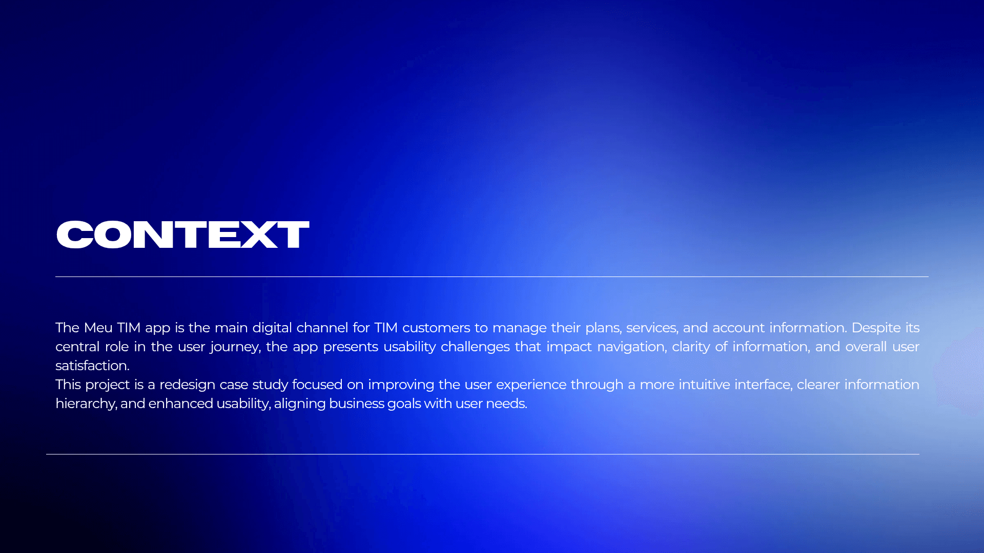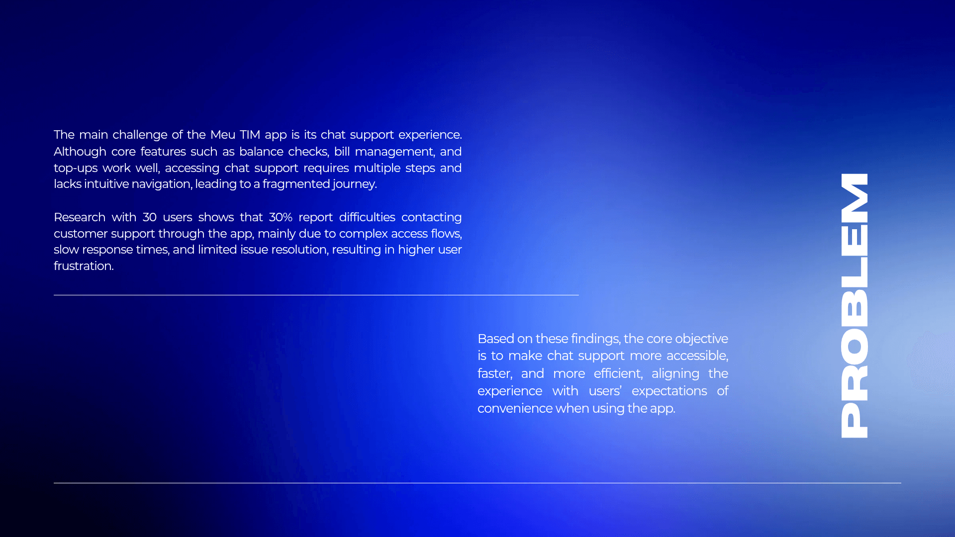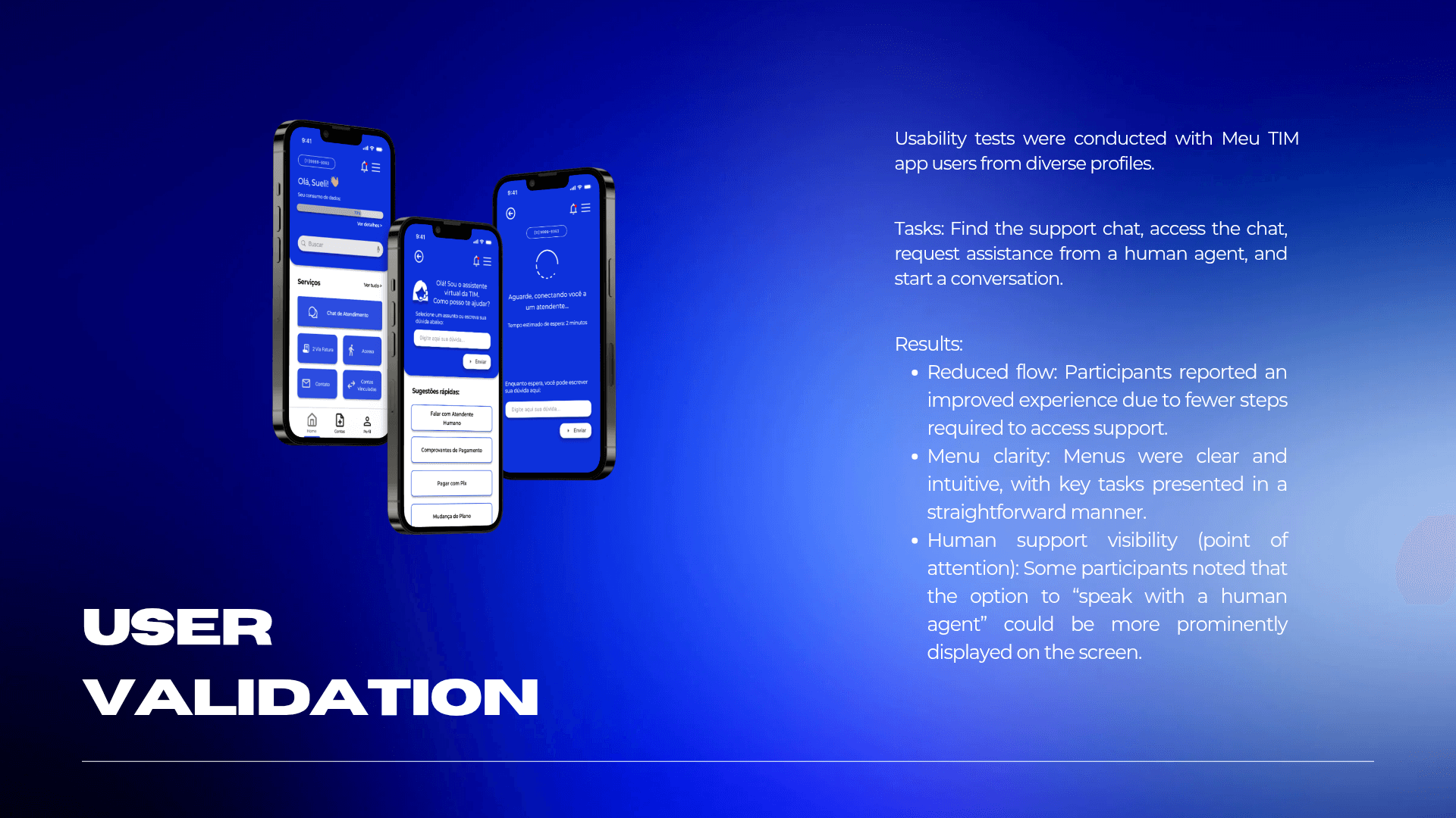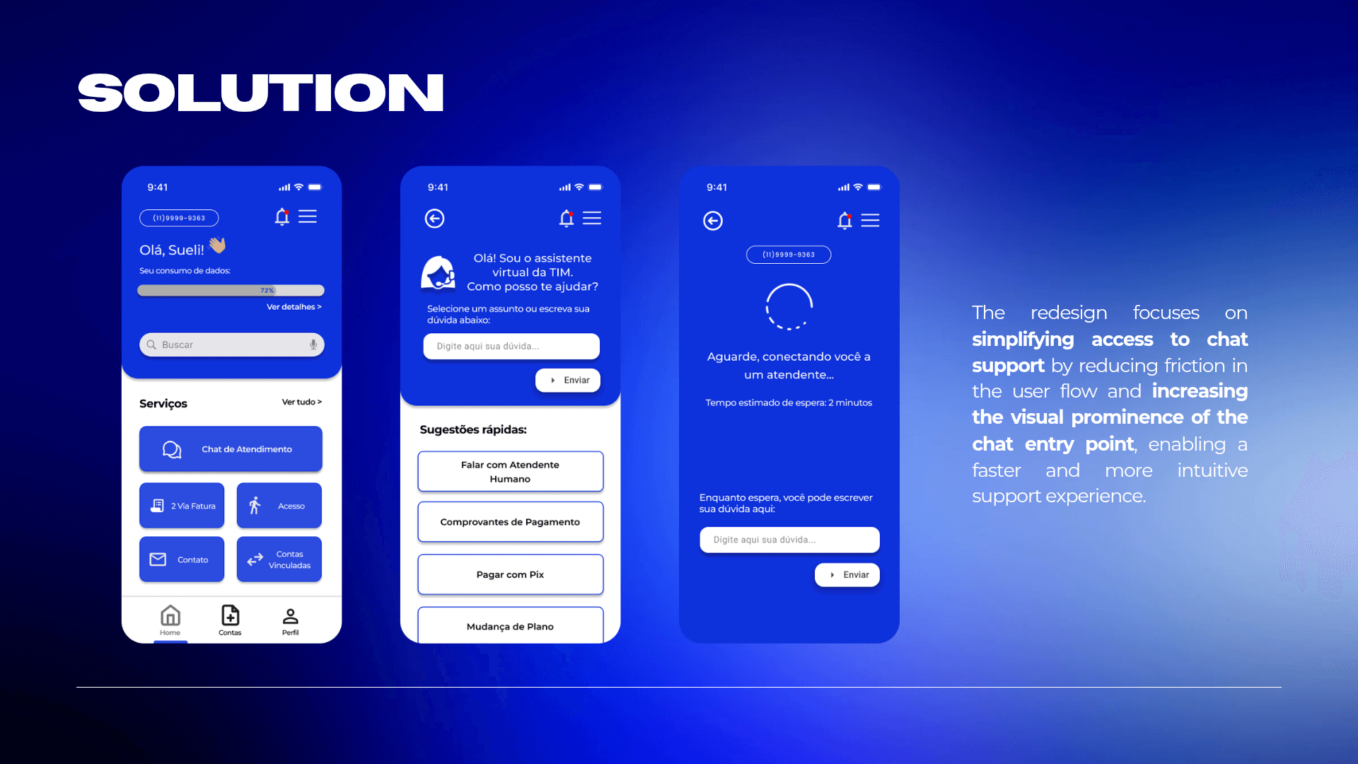 This project focused on redesigning the Meu TIM app to improve user autonomy and efficiency through a data-driven approach. By conducting in-depth user research to identify critical friction points, I developed a streamlined solution that simplifies navigation and reduces the steps required to access key features, such as chat support. The resulting design provides a more intuitive, modern interface that minimizes user frustration and strengthens the app's overall perceived value.