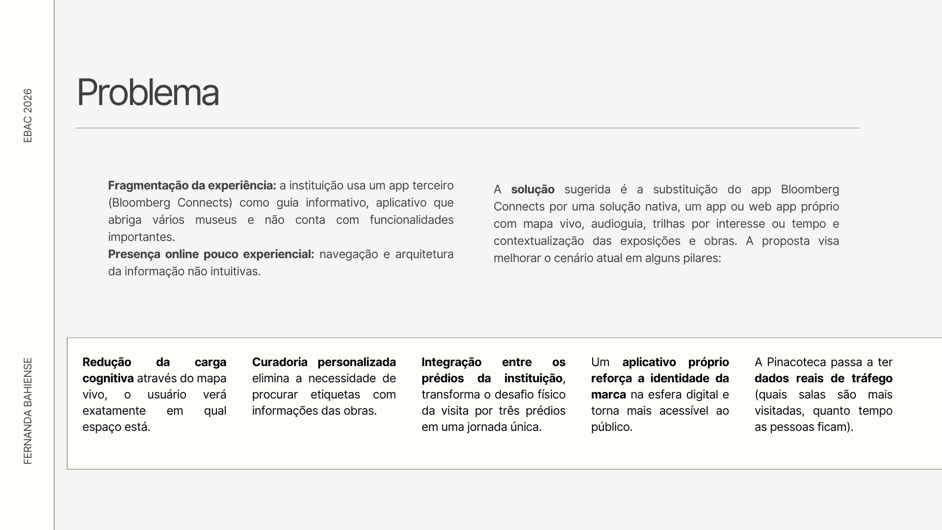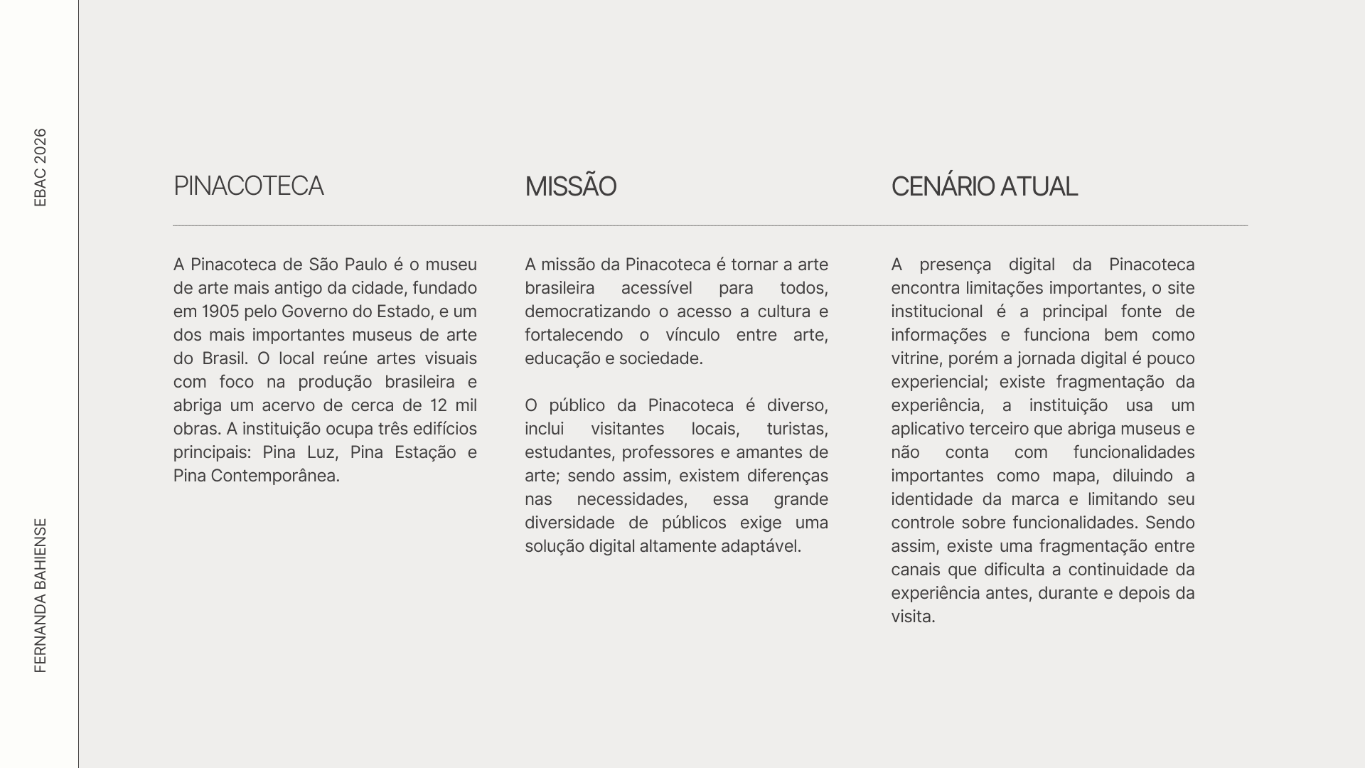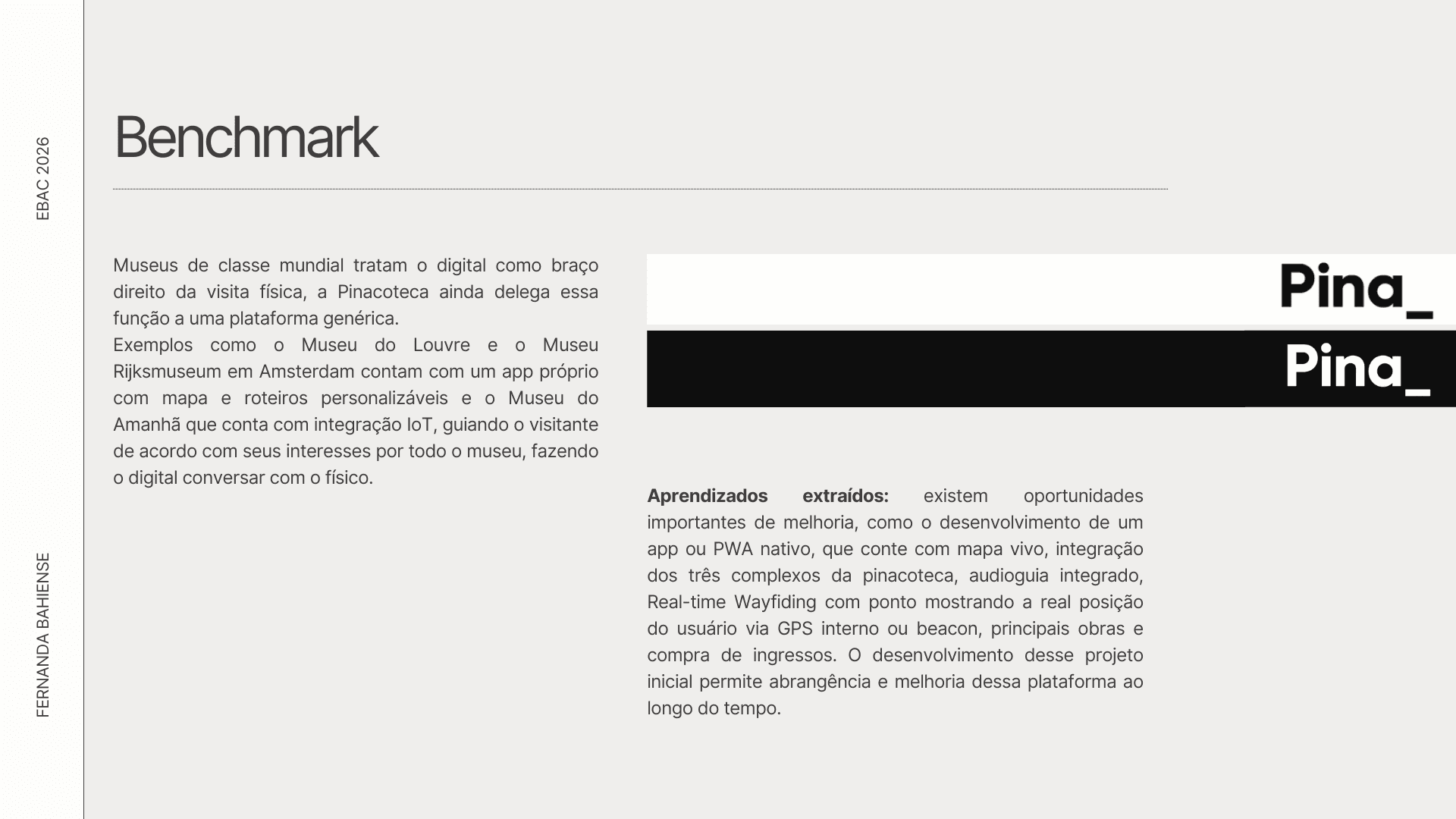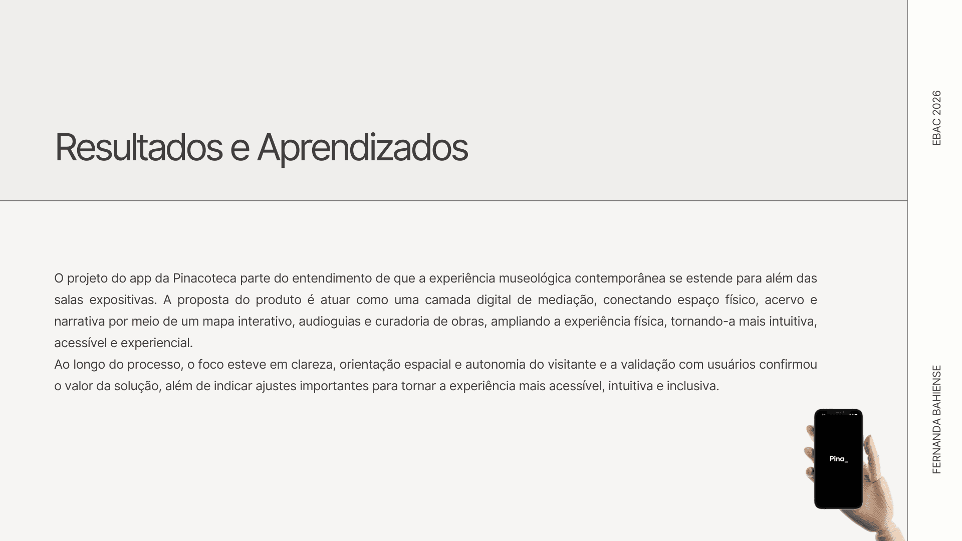 Um estudo de caso de UX/UI explorando o design e a construção de um aplicativo nativo que amplia a experiência do museu além dos espaços de exposição. O projeto propõe uma solução digital integrada conectando espaço físico, coleção e narrativa através de mapas interativos, guias de áudio e curadoria personalizada, melhorando a clareza, acessibilidade e autonomia do visitante.