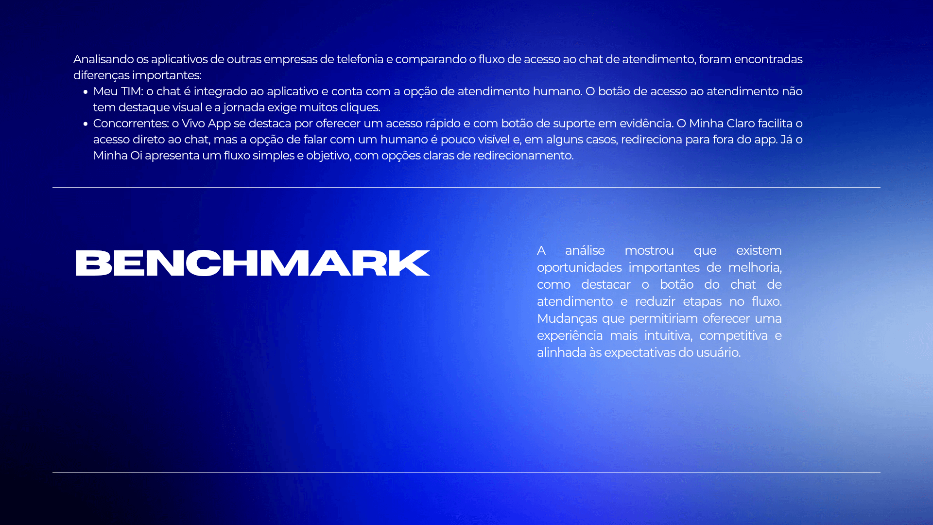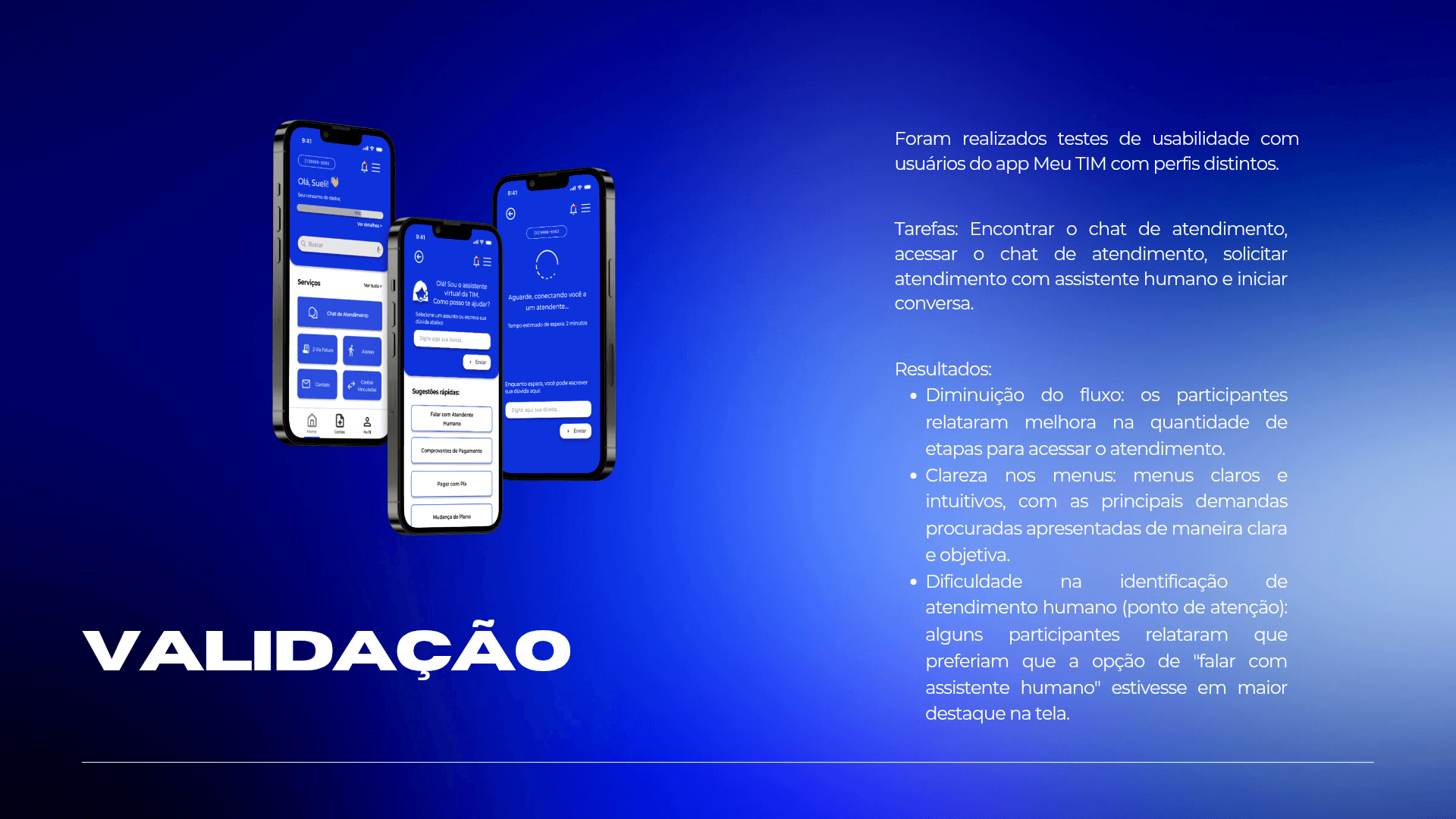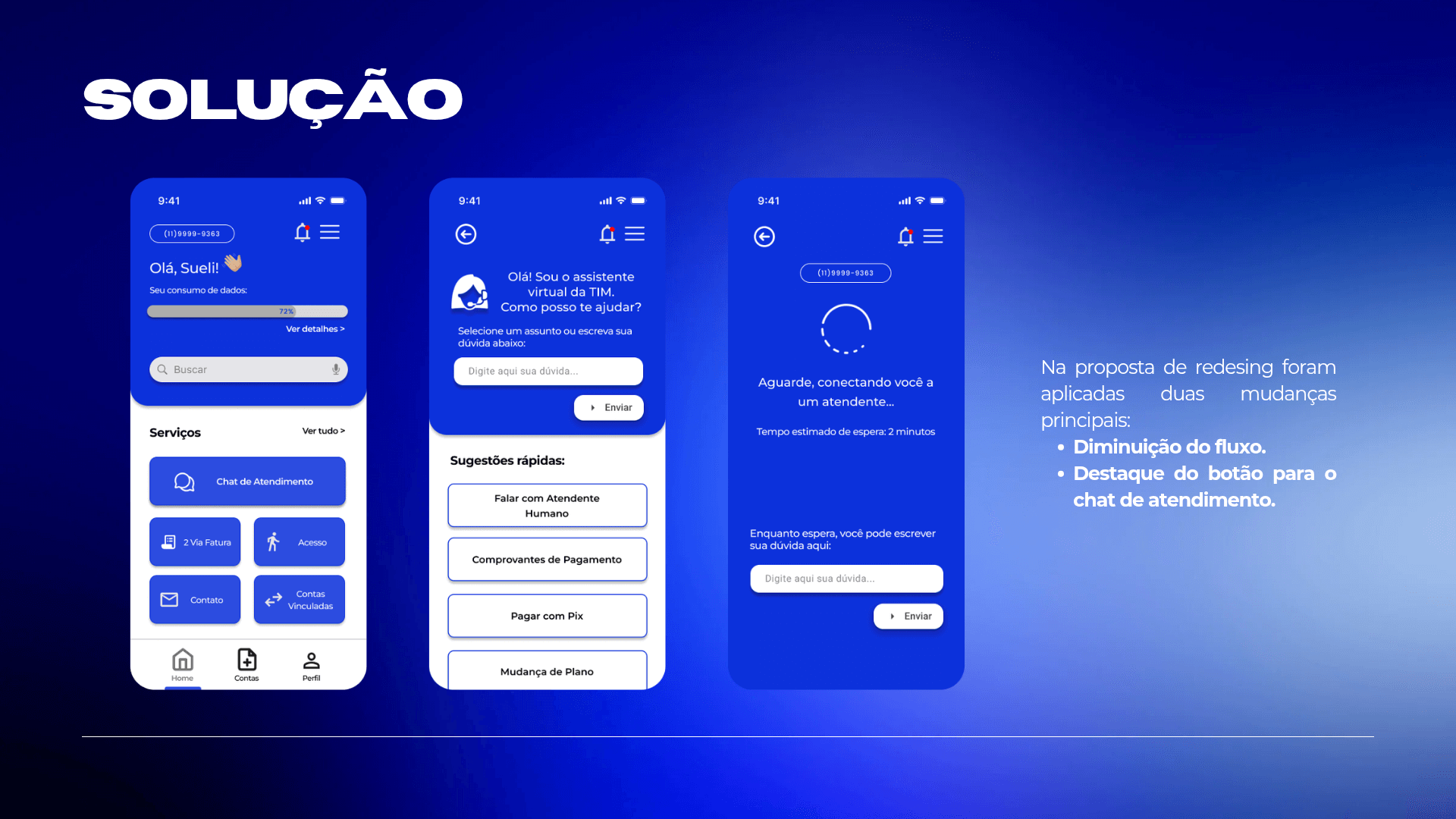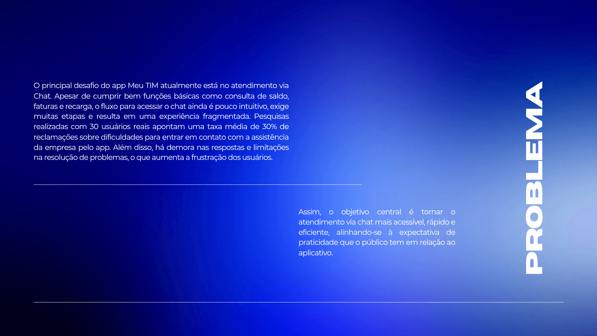 Este projeto se concentrou na redesign do aplicativo Meu TIM para melhorar a autonomia e eficiência do usuário por meio de uma abordagem orientada por dados. Ao realizar uma pesquisa aprofundada com os usuários para identificar pontos de fricção críticos, desenvolvi uma solução simplificada que torna a navegação mais fácil e reduz as etapas necessárias para acessar recursos importantes, como suporte por chat. O design resultante oferece uma interface mais intuitiva e moderna que minimiza a frustração do usuário e fortalece o valor percebido geral do aplicativo.